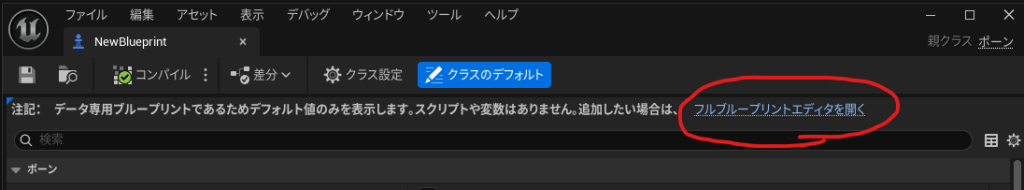 表示されたウィンドウの「フルブループリントエディタを開くをクリックします。