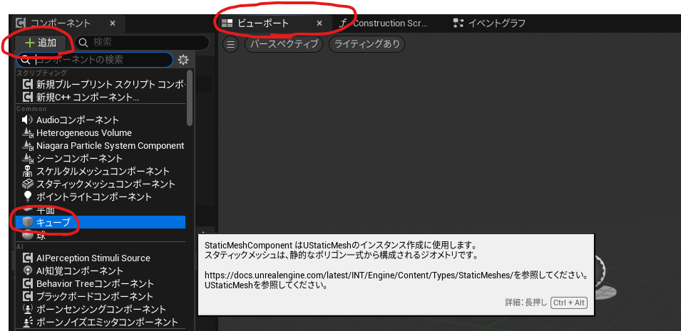 開いたウィンドウのビューポートを選択し、左側のコンポーネントの追加>キューブを選択します。