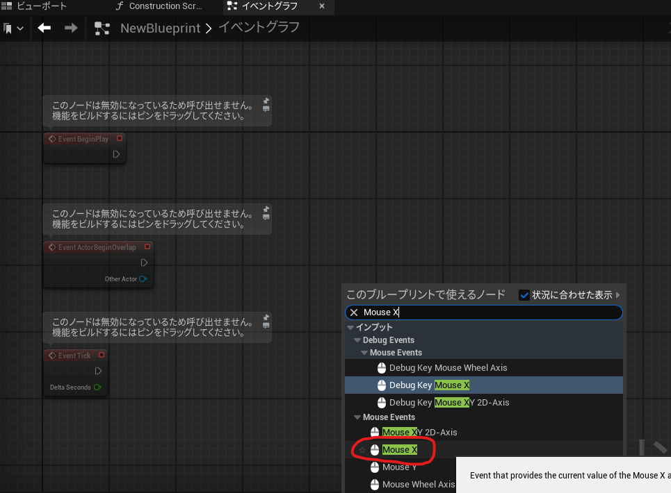 イベントグラフ上で右クリックからMouse Xを検索して選択します。