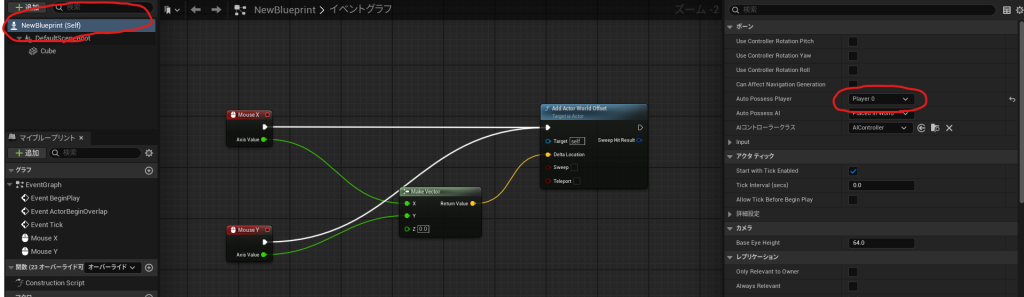 ポーンはコントローラー(今回はマウス)からの操作入力を受け取ることができるアクタになります。