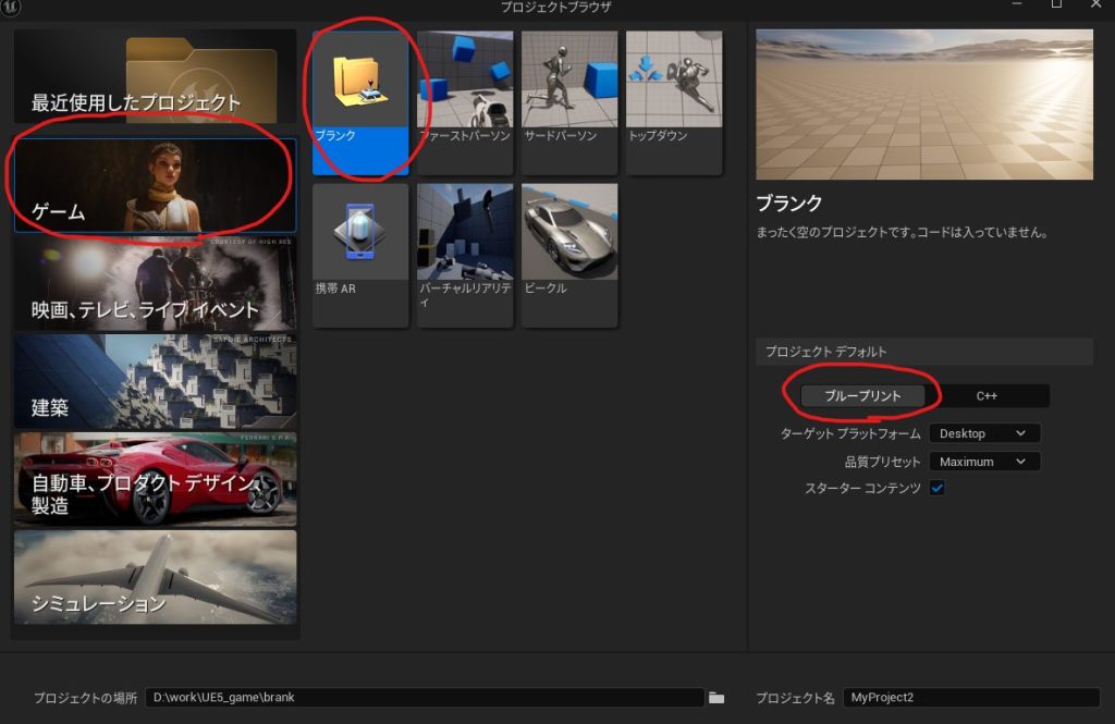 UEを開き、新規プロジェクトを作成します(ブループリントを選択)。