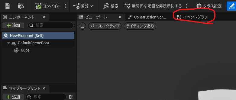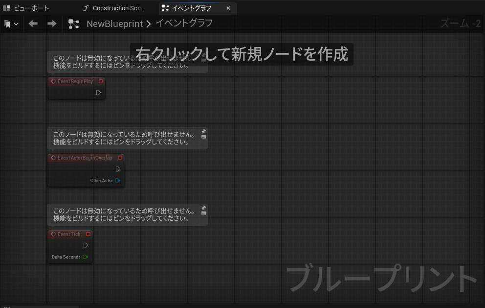 イベントグラフというのはこのブループリントがどの条件でどうやって動くのかを自分で設計する部分です。