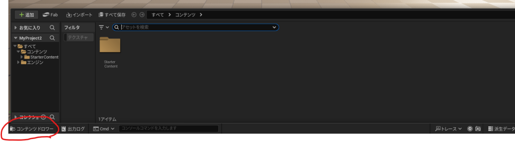 (ここで色々なアセットやマテリアルを確認できます。Windowsのエクスプローラーのようなものです。)