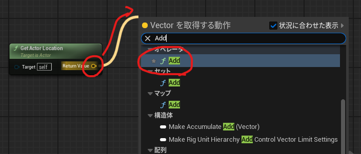 Get Actor LocationノードのReturn Valueを左クリックした状態で右に引っ張ります。