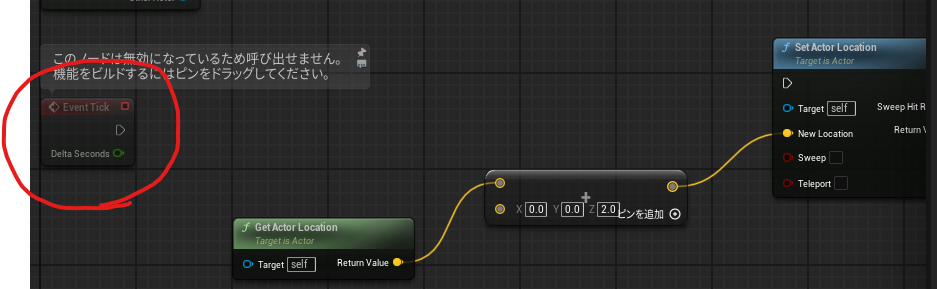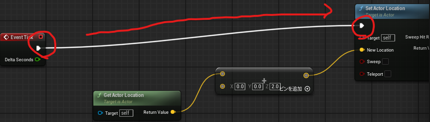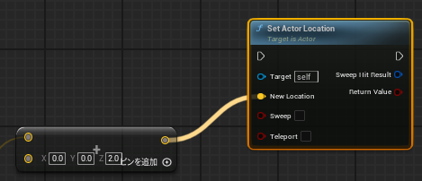 Event TickノードのピンをSet Actor Locationノードのピンにつなげていきます。