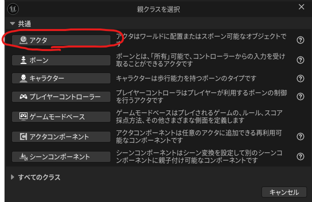 コンテンツドロワーにCubeのブループリントクラスがあることを確認する。