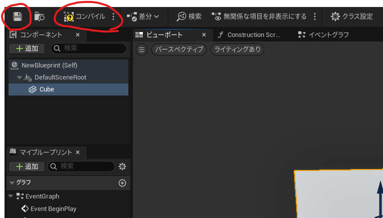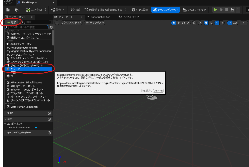 (先ほど述べた通り、ブループリントクラスは設計図ですから何を設計するのかは自分で決めてあげないといけません。今回はキューブという立方体を設計するということです。